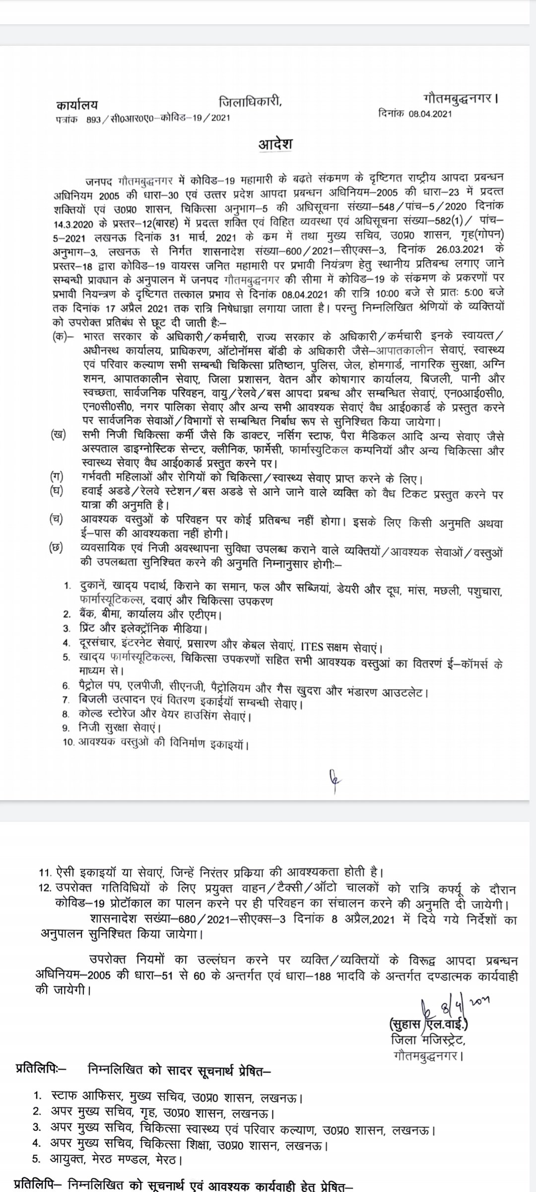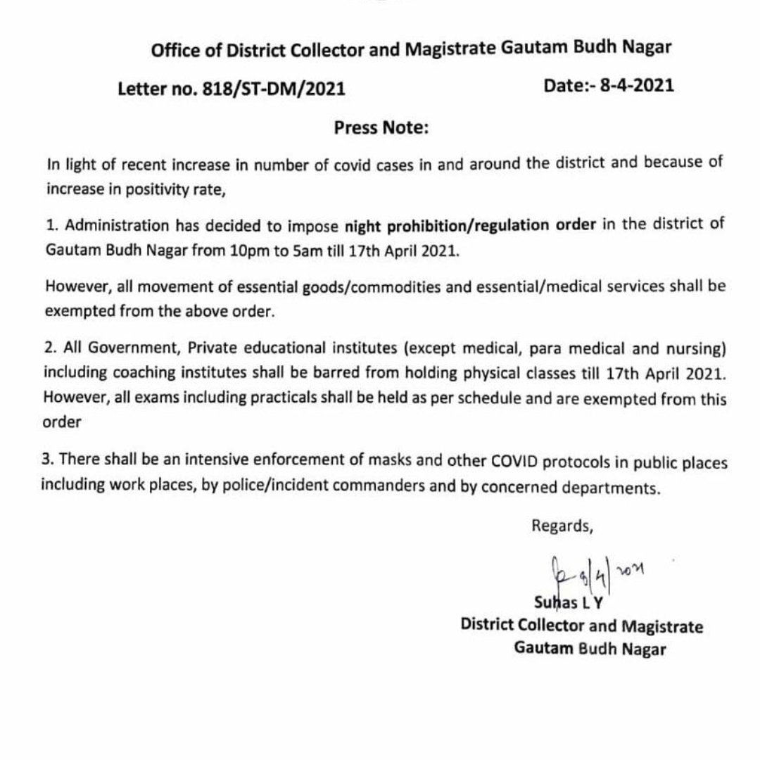 नोएडा में आज रात से 17 अप्रैल तक 10 से 5 बजे तक नाईट कर्फ्यू लगाया,गौतमबुद्धनगर DM सुहास एल वाई ने आदेश दिया। दरअसल कल रात मुख्यमंत्री के 13 जिलों के जिलाधिकारियों से वीडियो कांफ्रेंसिंग के बाद से ये अनुमान लगाया जाने लगा था कि आज रात से नोएडा में भी नाइट कर्फ्यू लग जाएगा।