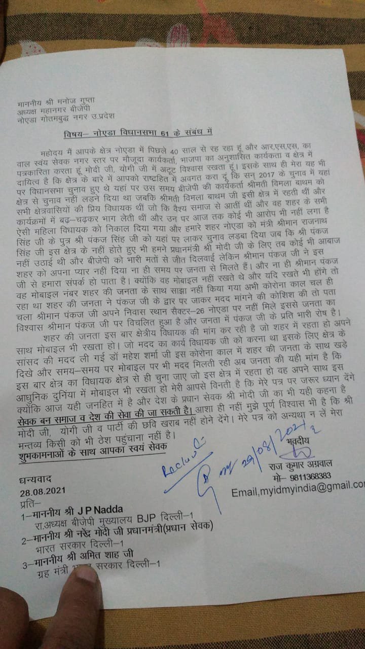 भारतीय जनता पार्टी में नोएडा भाजपा विधायक पंकज सिंह के खिलाफ आवाज इतनी शुरू हो गई है लोगो के आरोप है कि पंकज सिंह नोएडा में कम और लखनऊ में ज्यादा रहते है । 40 वर्षों से संघ कार्यकर्ता राजकुमार अग्रवाल ने नोएडा महानगर अध्यक्ष मनोज गुप्ता को इस बाबत पत्र लिखा है उन्होंने अपने पत्र में पंकज सिंह पर बाहरी होने के आरोप लगाते हुए कहा कि पंकज सिंह दिल्ली में रहते हैं उनका फोन नंबर किसी कार्यकर्ता के पास नहीं है ना ही फोन से संपर्क कर सकता है कोरो ना काल में पंकज सिंह की जगह डॉ महेश शर्मा काम करते हुए दिखाई दिए ।